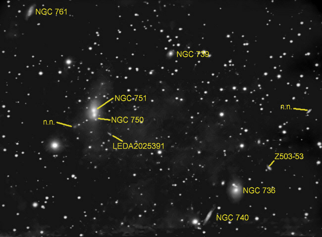 NGC 739 ist mit 14,1 mag Größenklassen merklich lichtschwächer. Die 208 Millionen Lichtjahre entfernte S0-Galaxie ist eine seltene Zwischenform von Ellipse und Spiral-Nebel. - NGC 740, ebenfalls 14,1 mag hell, ist eine 211 Millionen Lichtjahre entferne Balkenspirale. Also vom Typus unsere Milchstraße ähnlich.