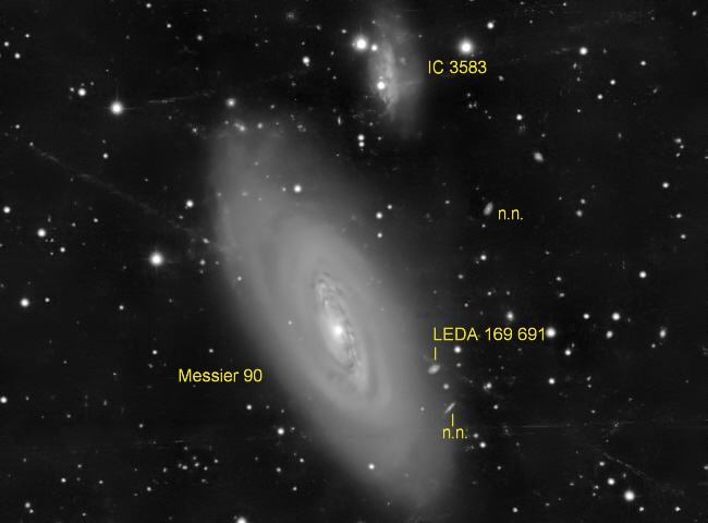 Das hier gezeigte Bild wurde 54 Minuten lang mit dem großen Teleskop der Sternwarte belichtet. Die diffusen äußeren Spiralarme sind gut zu erkennen. Nur im inneren Bereich zeigen einige Staubwolken deutlichere Spiralarmstrukturen. Die Begleitgalaxie IC 3583 zeigt auf Messier 90 ausgerichtet zahlreiche Verdichtungen – Regionen intensiver Sternentstehung. Der diffuse Umriss von IC 3583 lässt auf die frühere Form einer elliptischen Begleitgalaxie schließen.
