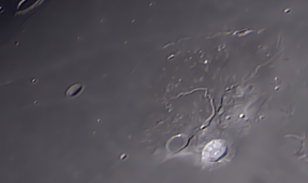 Die dunkle Region zwischen Aristoteles und dem kraterübersäten Hochland ist das kleine Mare Frigoris. Ganz am Mondrand hebt sich ein Teil der Kraterwand von Nansen gegen den dunklen Nachthimmel.
