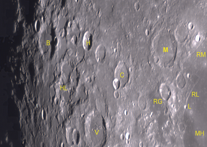- RG: Die Rimae de Gasparis ist eine 130 Kilometer lange, nur schwach sichtbare Schlucht, die zwischen den Kratern Liebig (37 Kilometer, rechts oben von RG) und dem lavaüberfluteten Krater Gasparis (30 Kilometer, links unten) verläuft. Solche Grabensystem entstehen zumeist durch einbrechende Lavaröhren im Untergrund.