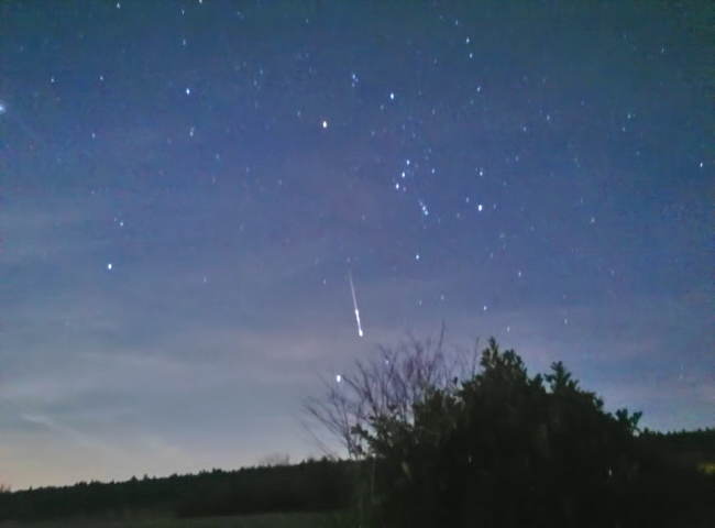 Bei einem der freihändig geschossenen Bilder mogelte sich eine sehr helle Sternschnuppe aus dem Strom der Geminiden ins Bild. Auf ihrem glühend-heißen Ritt durch die Atmosphäre zerbrach das kleine Steinchen in mehrere Stücke, erkennbar an den dicken Aufhellungen in der Leuchtspur.