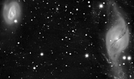 Zwei Kugelsternhaufen im Größenvergleich: Mit einer Erdnähe von 7.500 Lichtjahren ist Messier 4 der uns am nächsten gelegene galaktische Kugelsternhaufen. Für uns tief am südlichen Himmel im Sternbild Skorpion stehend, zeigt das (große) Bild den Haufen trotzdem mit überraschend großer Detailfülle. Im gleichen Größenverhältnis ist daneben der kleine, weil mit 275.000 Lichtjahren viel weiter entfernte Kugelsternhaufen NGC 2419 zu sehen. Beide Bilder entstanden mit dem ACF16 Teleskop der Sternwarte Huchenfeld und zeigen im Vergleich eindrucksvoll die räumlich Tiefe des galaktischen Halos unserer Milchstraße.