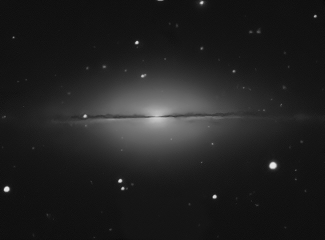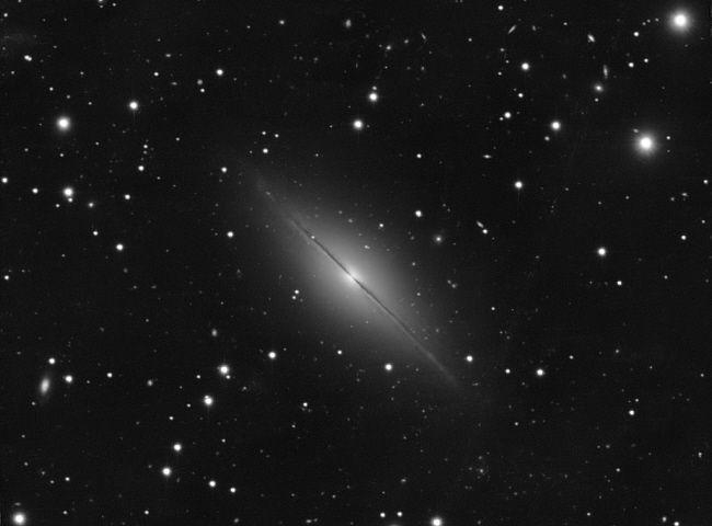 Hinter der Katalognummer NGC 7814 verbirgt sich eine (vermutlich) spiralförmige Galaxie. Die genaue Struktur ihrer Spiralarme können wir nicht erkennen, da wir auf die Galaxie genau von ihrer Kantenseite blicken – eine sogenannte edge-on Stellung. Diese interessante Galaxie ist 54 Millionen Lichtjahre von unserer Milchstraße entfernt. Daraus errechnet sich ihr wahrer Durchmesser zu 90.000 Lichtjahren, deutlich kleiner als unsere Heimatgalaxie.
