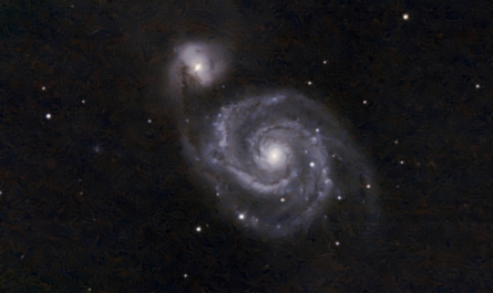 Bei einer Belichtungsreihe mit dem hellen Galaxienduo Messier 84 und 86 an der Sternwarte Huchenfeld ist ein Satellit durch das Bild gehuscht. Sehr schön lässt sich an der Leuchtspur auch die Drehbewegung erkennen, mit der Satelliten üblicherweise ihren Flug stabilisieren. Da inzwischen unzählige Satelliten die Erde umkreisen, sind solche Bilder durchaus häufiger auf den Belichtungen einer Sternwarte zu sehen. Auch wenn das Arrangement schön und ungewöhnlich aussehen mag, so muss das Bild doch verworfen werden und ist für die Belichtungsreihe am Himmelsobjekt nicht mehr verwendbar.