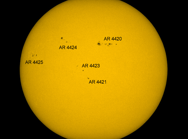 In den zurückliegenden Tagen haben sich auf der Sonne einige Fleckengruppen gebildet. Sie zeichnen sich allerdings überwiegend durch kleine und kleinste Einzelflecken aus, deren Lebensdauer zumeist nur nach Tagen, in Extremfällen sogar nur Stunden zählt. Im normalen Weißlicht waren die kleinen Fleckengruppen ein interessantes Beobachtungsobjekt im großen Sonnenrefraktor.