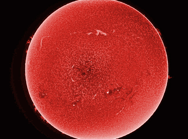 Im monochromatischen Licht der roten H-alpha Wellenlänge des Wasserstoffs zeigte sich unser Zentralgestirn heute etwas lebhafter mit zahlreichen, kleineren Protuberanzenbögen am Sonnenrand und vielen Filamenten vor der Oberfläche.
