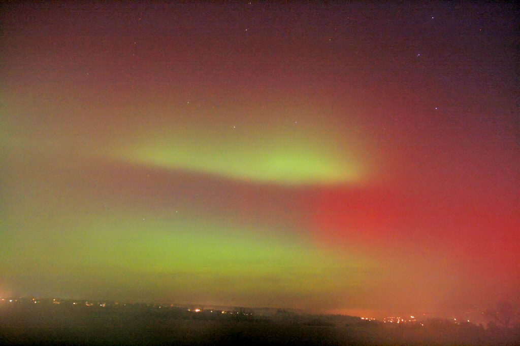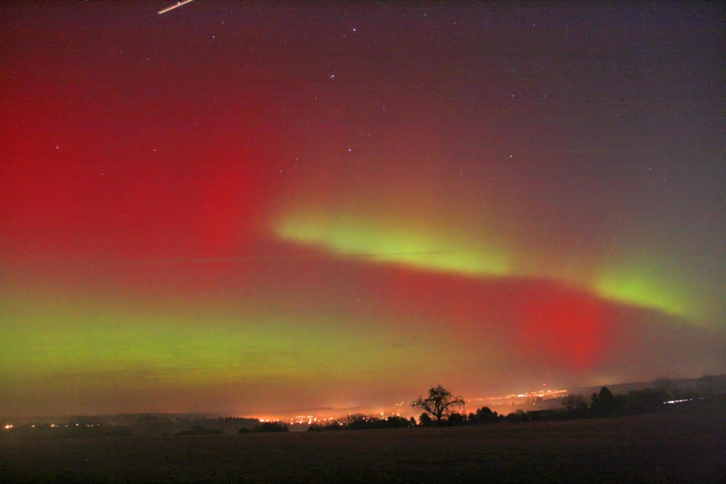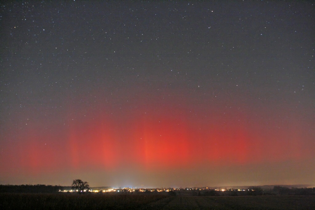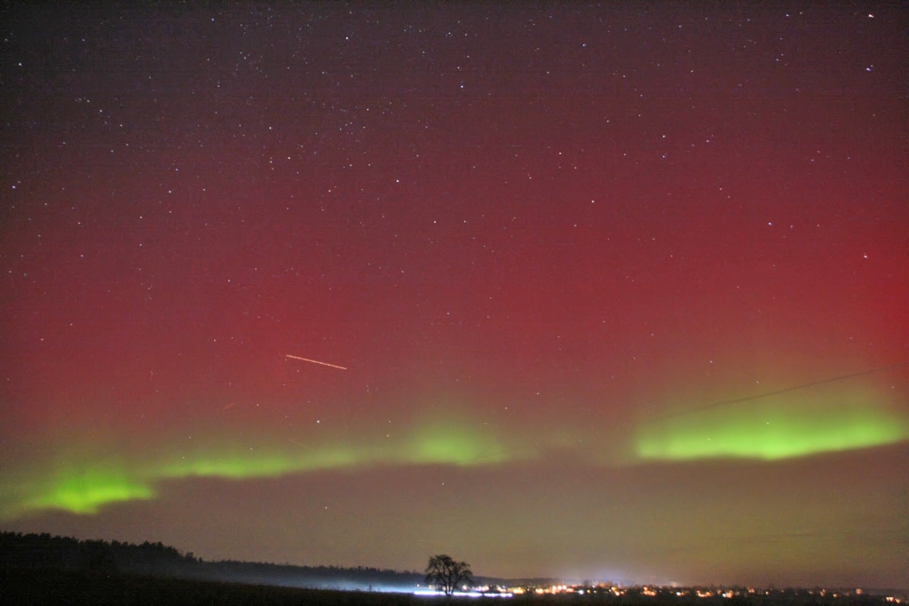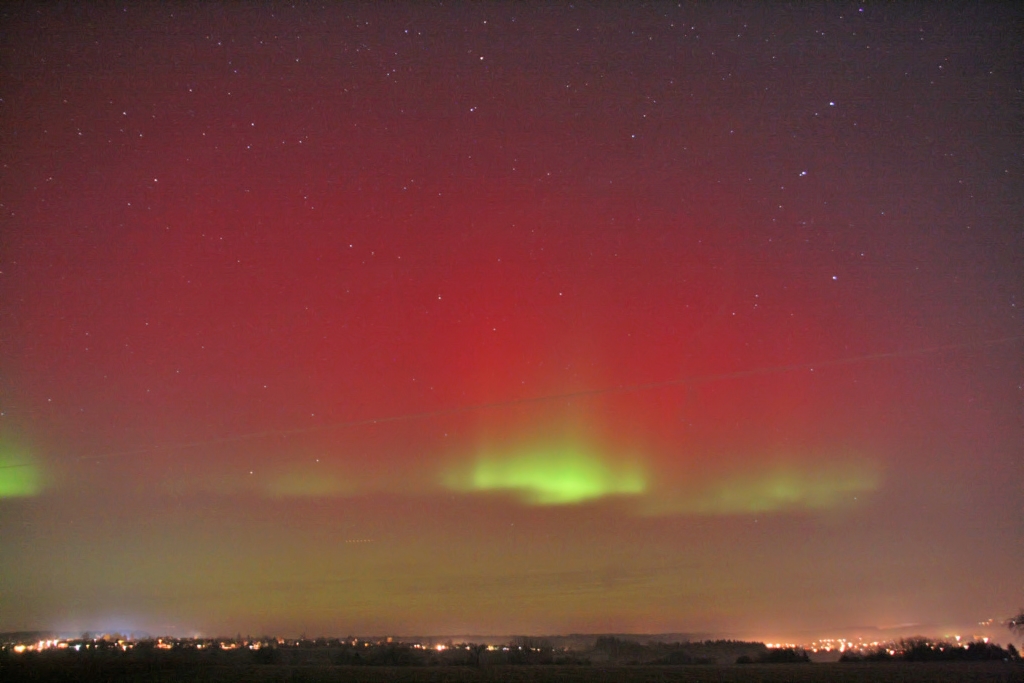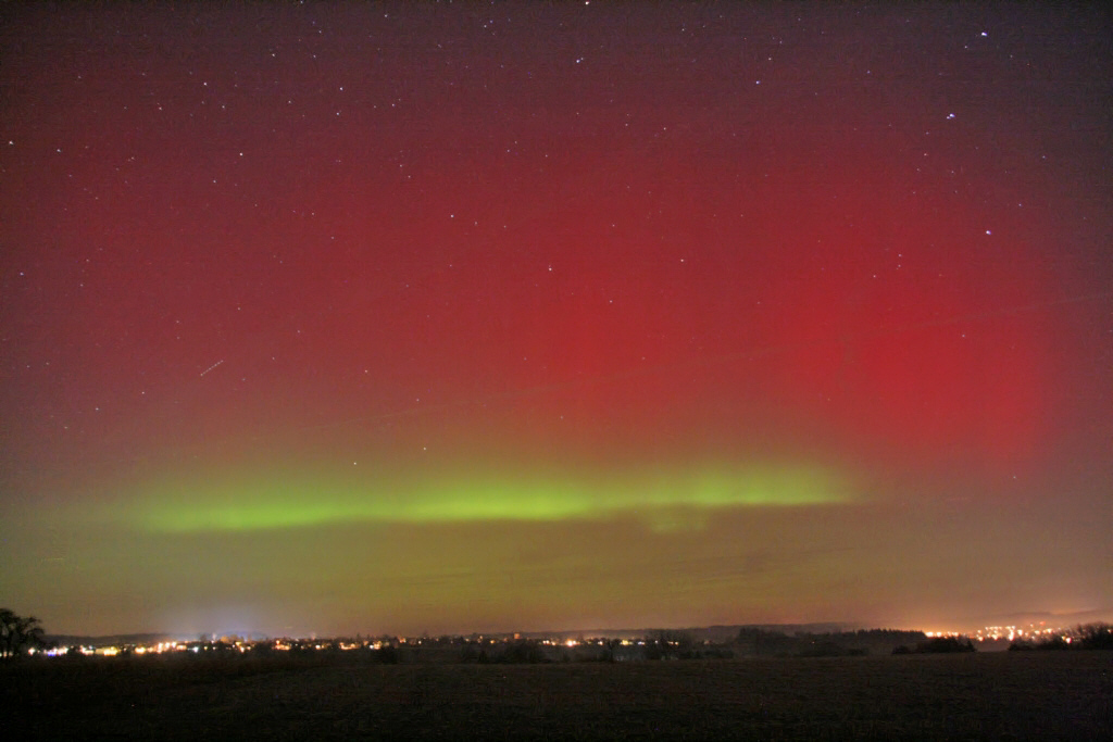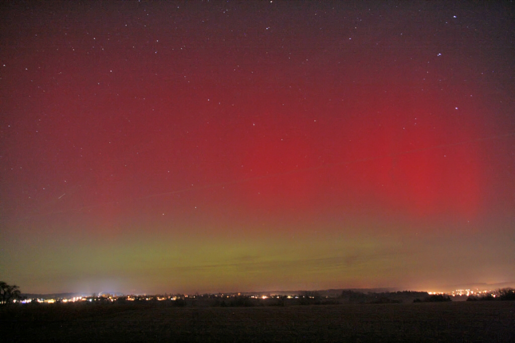 Aber auch von Huchenfeld aus konnten wir ein Bild des Polarlichts machen. Eine vom Sternwartengelände aus gestartete Drohne flog bis über die Nebelschicht. So anstand ein beeindruckendes Bild vom Polarlicht über dem komplett im Nebelmeer liegenden Huchenfeld mit der grell ausgeleuchteten Hauptstraße (unten Mitte).