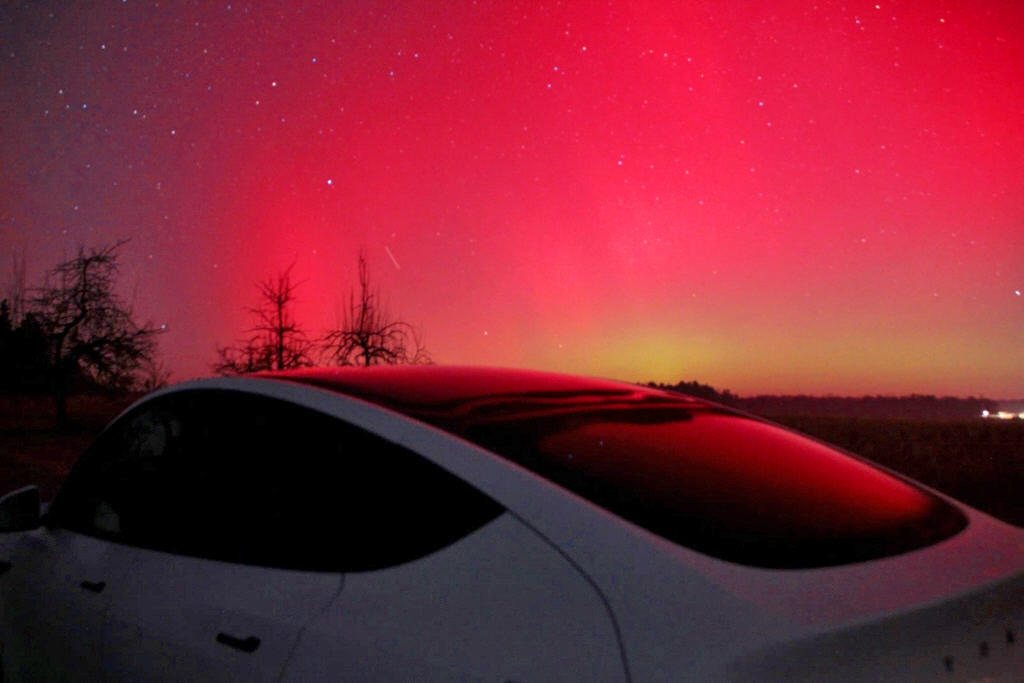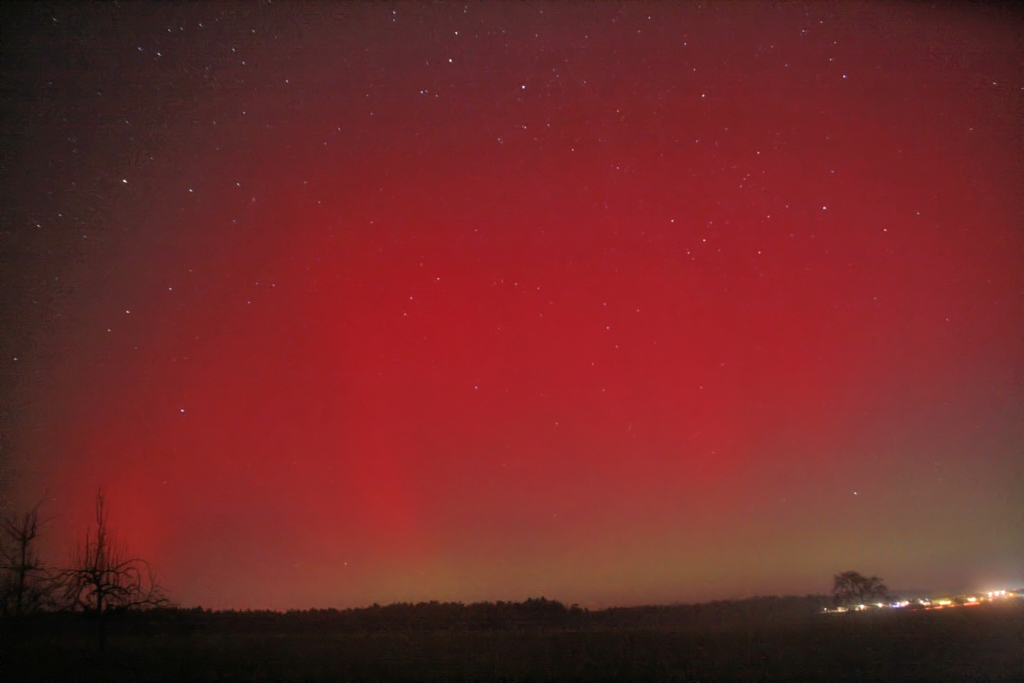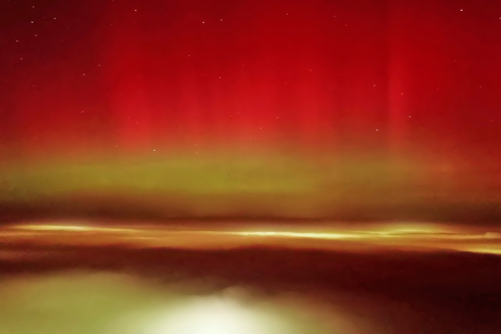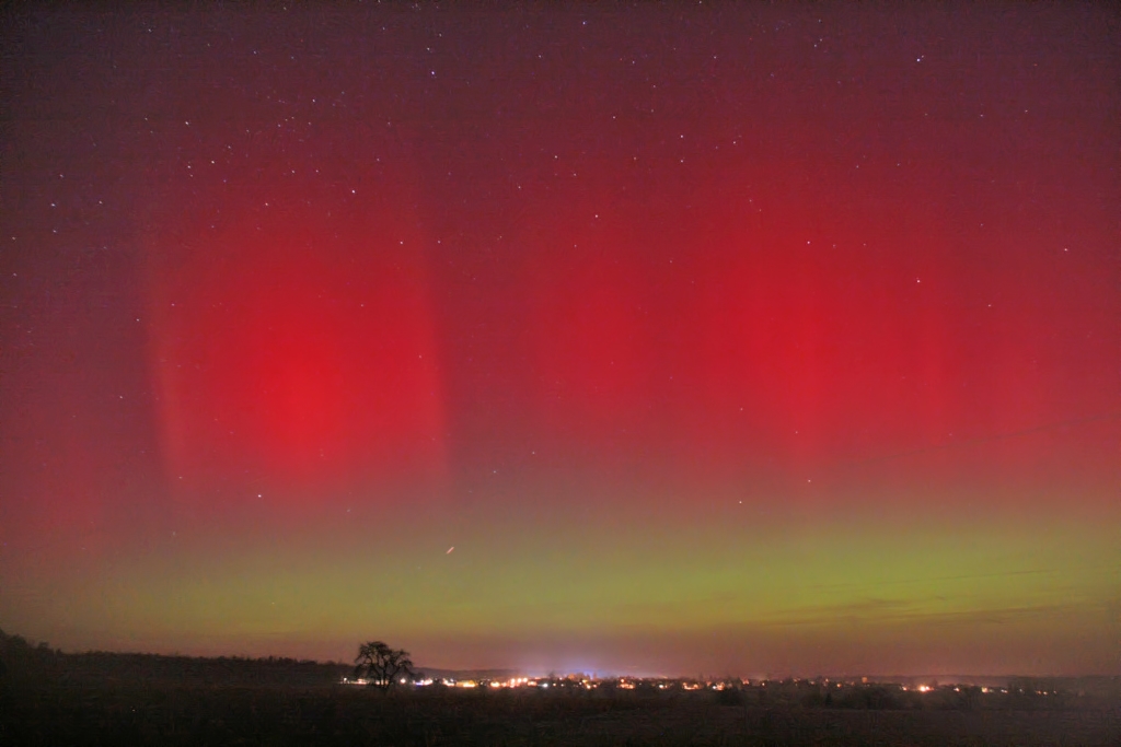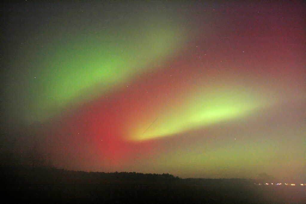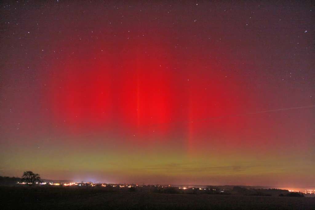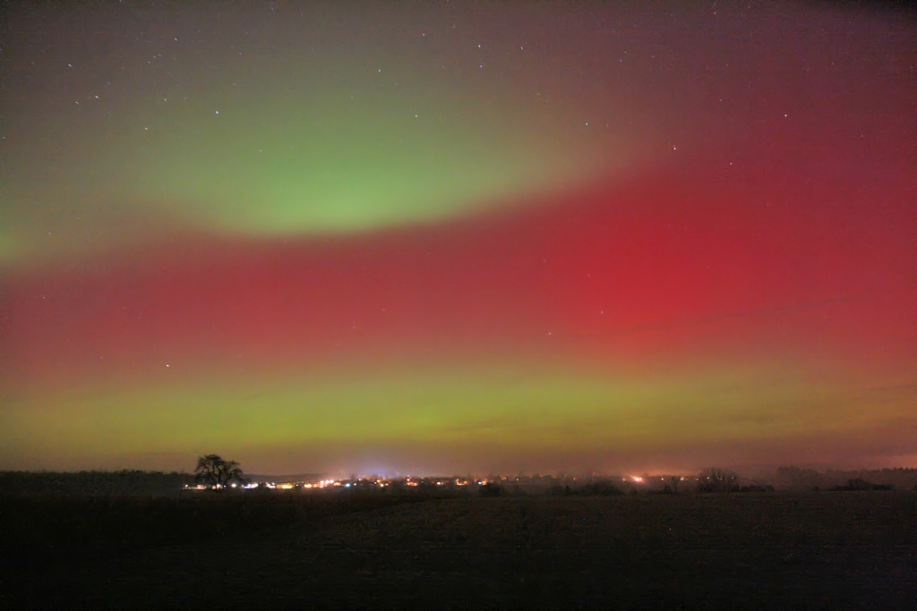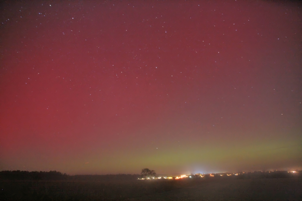 Aber auch von Huchenfeld aus konnten wir ein Bild des Polarlichts machen. Eine vom Sternwartengelände aus gestartete Drohne flog bis über die Nebelschicht. So anstand ein beeindruckendes Bild vom Polarlicht über dem komplett im Nebelmeer liegenden Huchenfeld mit der grell ausgeleuchteten Hauptstraße (unten Mitte).