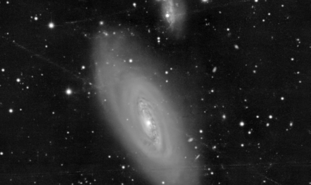 Die helle Spiralgalaxie Messier 66, auch als NGC 3627 katalogisiert, ist eine Spiralgalaxie, die 31 Millionen Lichtjahre von uns entfernt steht. Ihre morphologische Klassifizierung SABb bedeutet, dass sie eine Spiralform mit schwach ausgeprägten Balken und locker gewundenen Spiralarmen aufweist