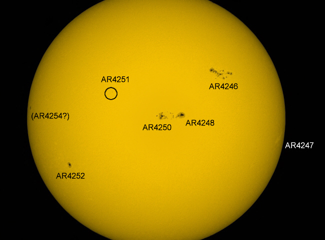 Hinter AR4251 verbirgt sich ein winziger Einzelfleck, der sich jedoch schon einige Tage hartnäckig behauptet, obwohl so kleine Flecken sich zumeist nach einigen Stunden oder wenigen Tagen wieder auflösen. Frisch in unser Gesichtsfeld rotiert sehen wir ganz tief am östlichen Sonnenrand einen neuen Fleck, der noch nicht katalogisiert wurde, aber die laufende Nummerierung AR4254 erhalten müsste.